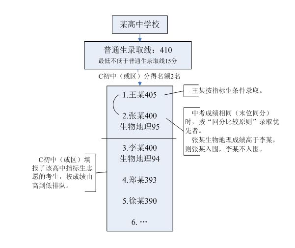 高中学校录取指标生按初中学校报该高中学校的考生人数,从高分至低分录取,但最低不低于该高中学校普通生录取线15分。录取时,首先在中招录取系统中对入围指标生的指标生志愿作相应技术标识,然后将指标生志愿连同非指标生志愿,与普通生一起划线投档。